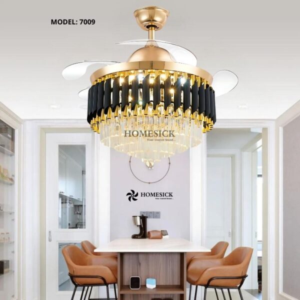 Với thiết kế cánh quạt cụp xoè độc đáo, quạt trần Homesick 7009 không chỉ là một thiết bị làm mát mà còn là một tác phẩm nghệ thuật. Thân quạt vàng óng ánh, kết hợp với các chi tiết tinh xảo, tạo nên điểm nhấn sang trọng cho mọi không gian. Động cơ DC siêu êm ái, tiết kiệm điện năng, mang đến trải nghiệm hoàn hảo cho người dùng.